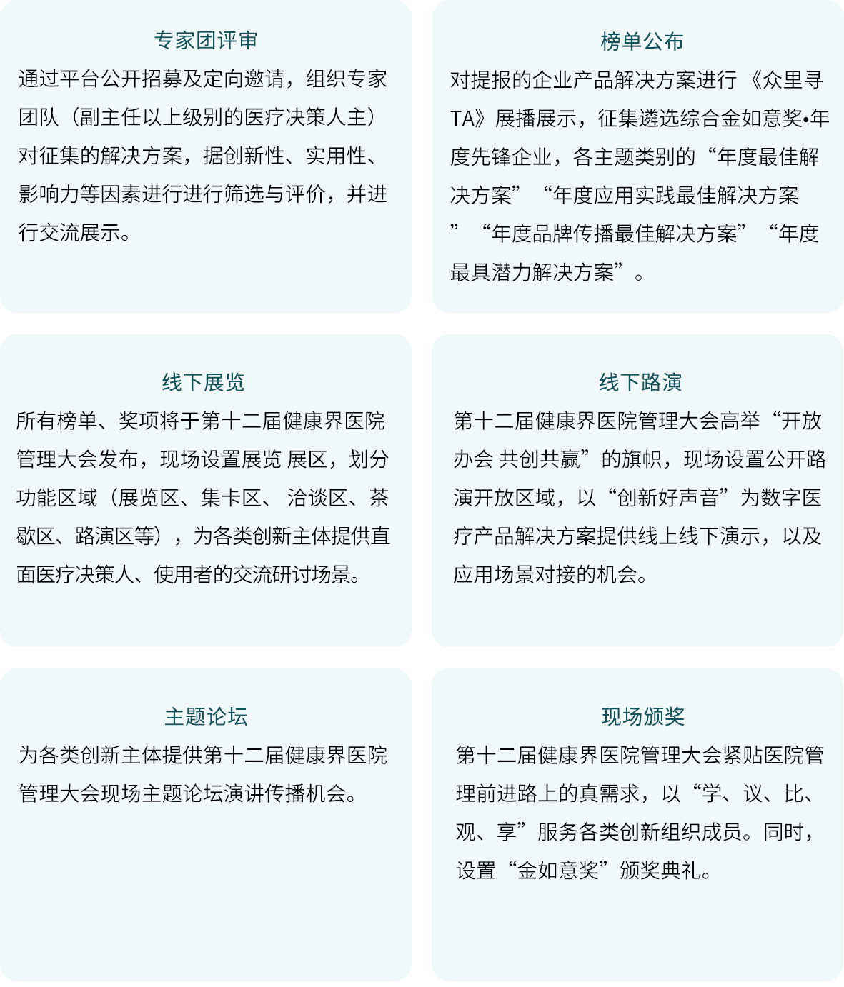 为发现具有技术先进、成果突出、示范引领的医疗健康创新产品解决方案,健康界联合中国医药教育协会数字医疗专业委员会推出「健康中国 • 金如意」优选解决方案项目(下简称“项目”)。项目围绕医院效能、患者体验、健康管理三大主题类别,以评选“金如意奖”为启动契机,塑造“专家团+榜单+展览+路演+论坛+奖项”全面运营体系,借力第十二届健康界医院管理大会(2024年11月•海口),打造医疗健康前沿研究及应用成果展示平台,实现医疗决策人、使用者的深度影响,推动医疗行业与新兴产业的深度融合,助力打造科技创新、应用落地的产业上下游联动、投融资对接、品效结合一体的交流平台。