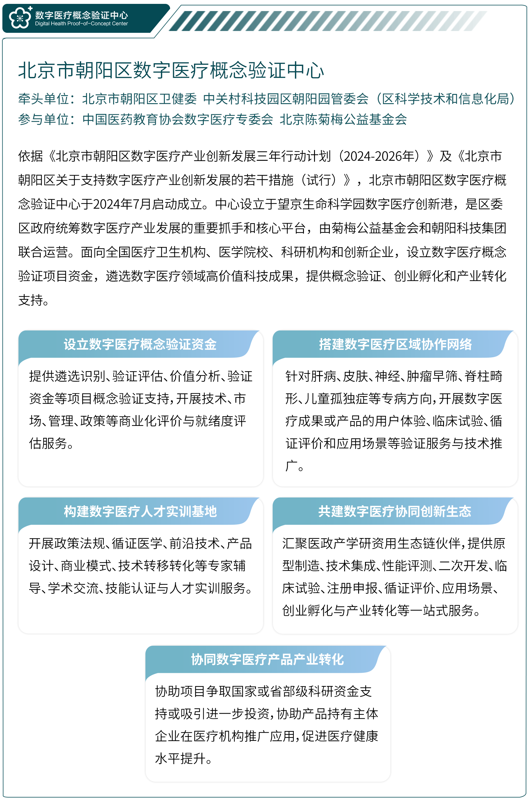 北京市朝阳区数字医疗概念验证中心是朝阳区委区政府统筹发展数字医疗产业的重要抓手和核心平台。中心在朝阳园管委会(区科信局)和区卫健委的指导下,由菊梅公益基金会、中国医药教育协会数字医疗专委会和朝阳科技集团共同运营。依托朝阳区优质医疗资源和数字经济产业优势,汇聚医企研融用多方力量,聚焦数字医疗产业重大实践问题和场景需求,提供项目遴选、资金资助、协同研发、临床验证、产品注册、人才实训和产业转化等服务。